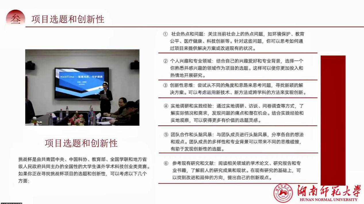 易雨分别从比赛介绍、项目选题和创新性、经验分享和互动交流三个方面展开详细阐述。她表示,同学们参加“凯普杯”2024年“挑战杯”中国大学生创业计划竞赛必须认真了解赛事规划和赛程安排,注重项目选题和创新性,同时要结合自己的专业特色和兴趣爱好,积极参考现有研究和文献资料,综合自身实践经验开展深入实地调研。她强调,“挑战杯”中国大学生创业计划竞赛为新时代青年提供了一个锻炼和展示自己的平台,充分培养了青年学子的创新精神和实践能力,有助于其职业发展和个人成长。