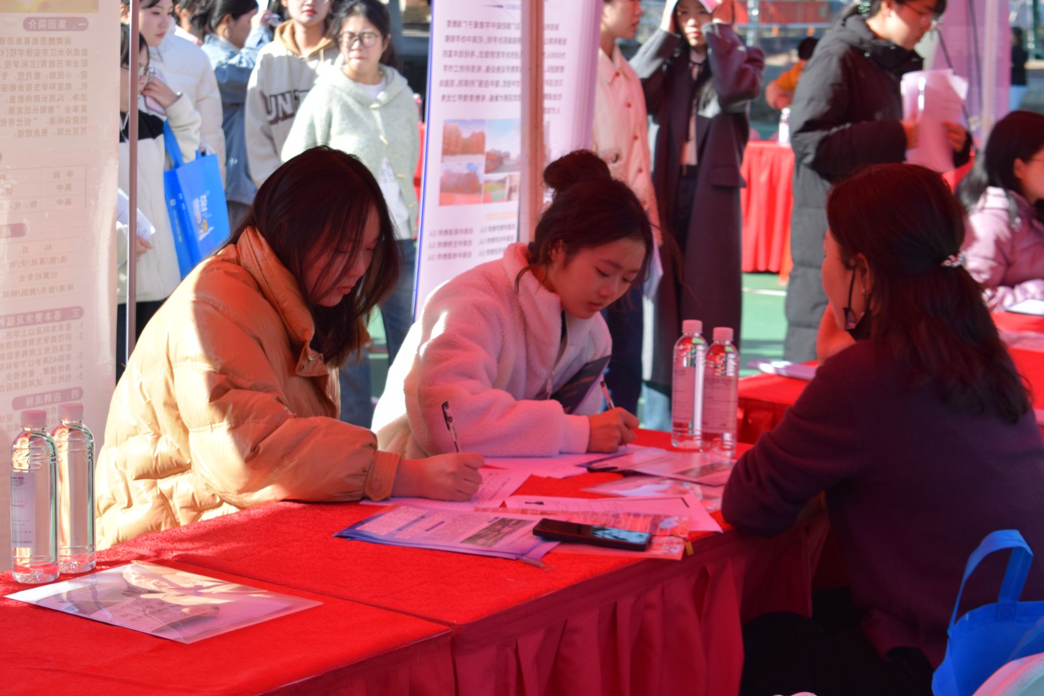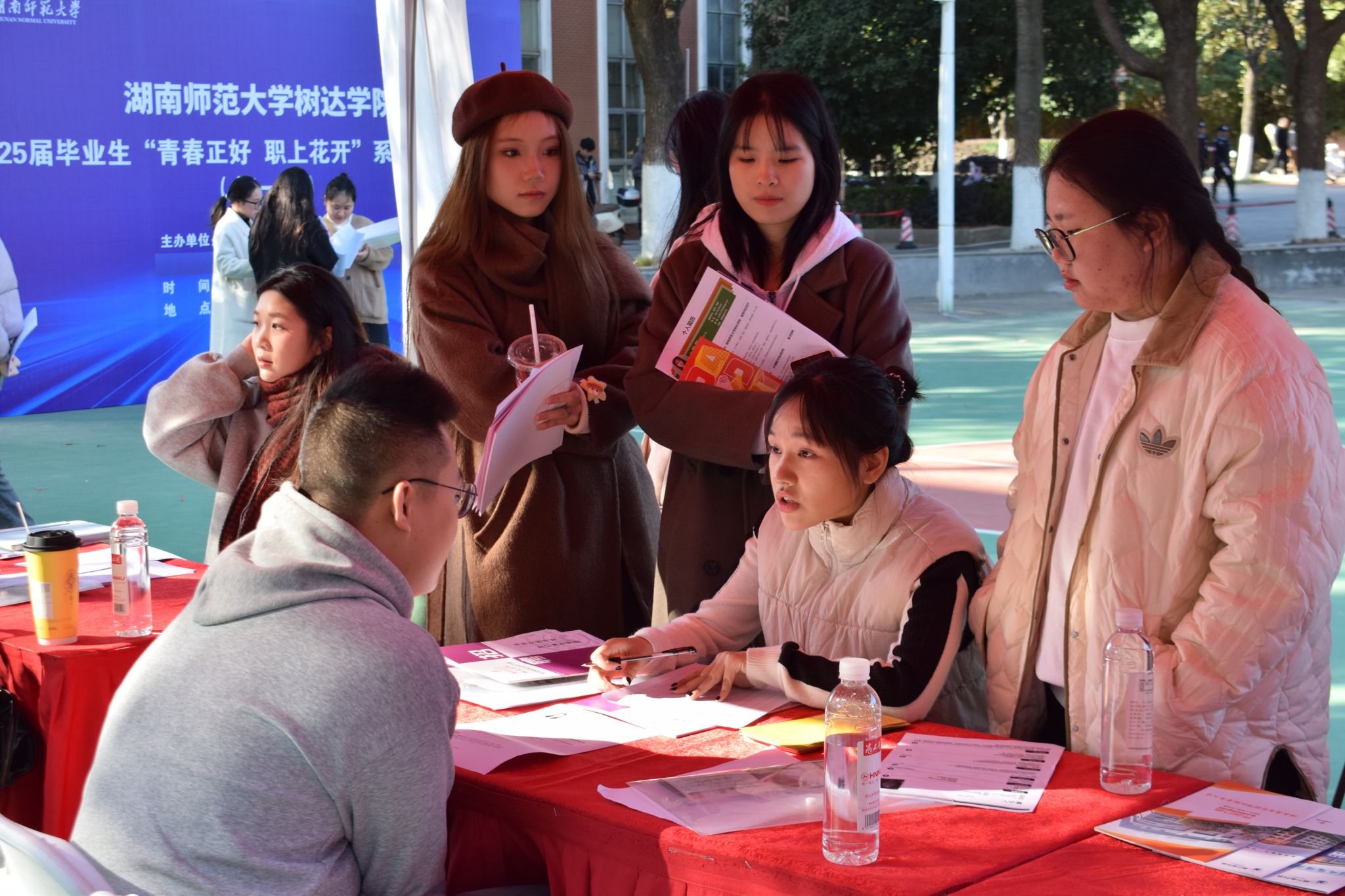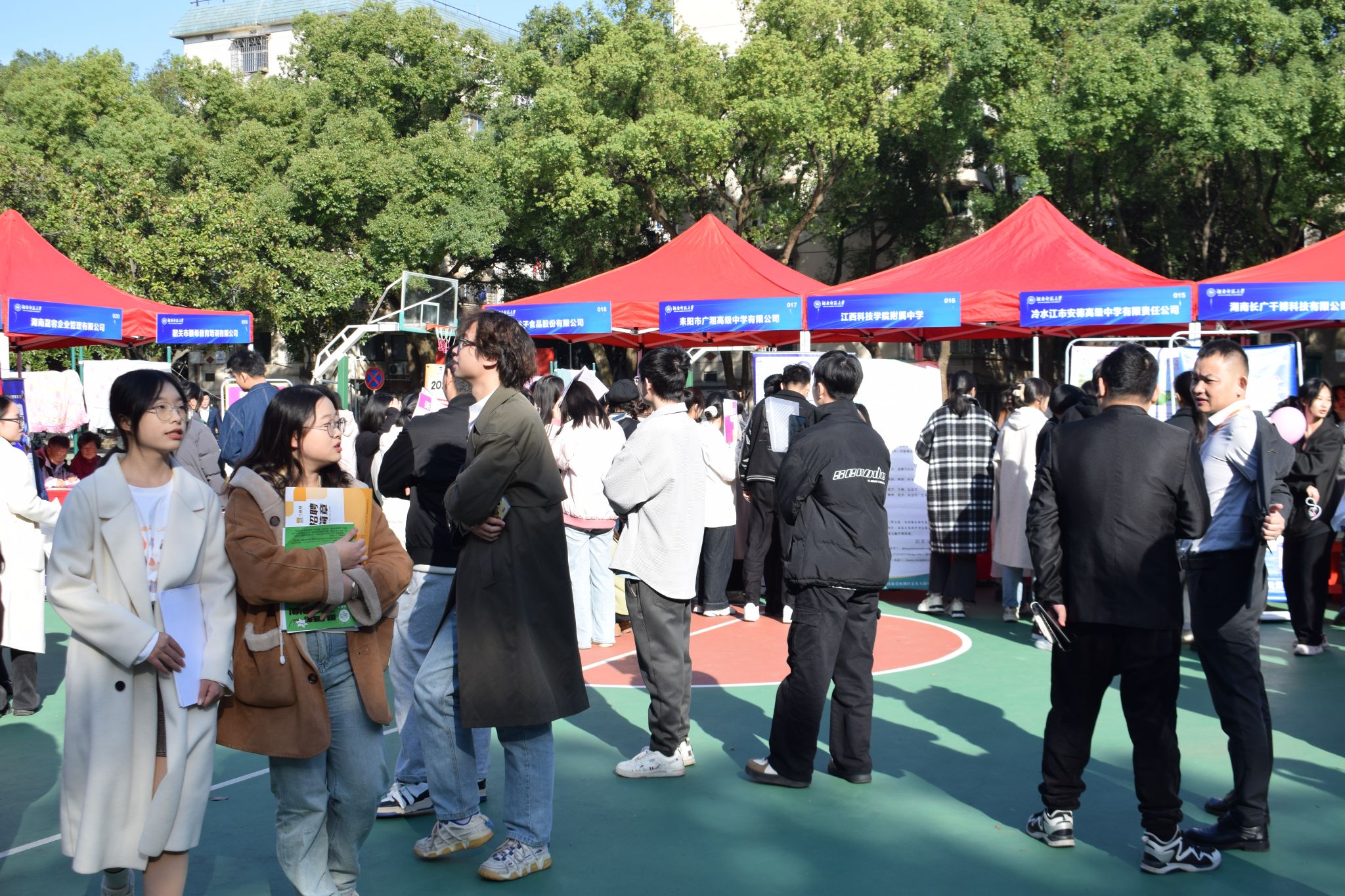 招聘会现场,学生们身着正装,手持精心准备的简历,满怀热情地与招聘代表交流。现场气氛热烈,学生们积极展示自己的能力与特长,企业代表耐心地解答学生的疑问,详细介绍公司文化和岗位要求,双方互动频繁,成效显著。