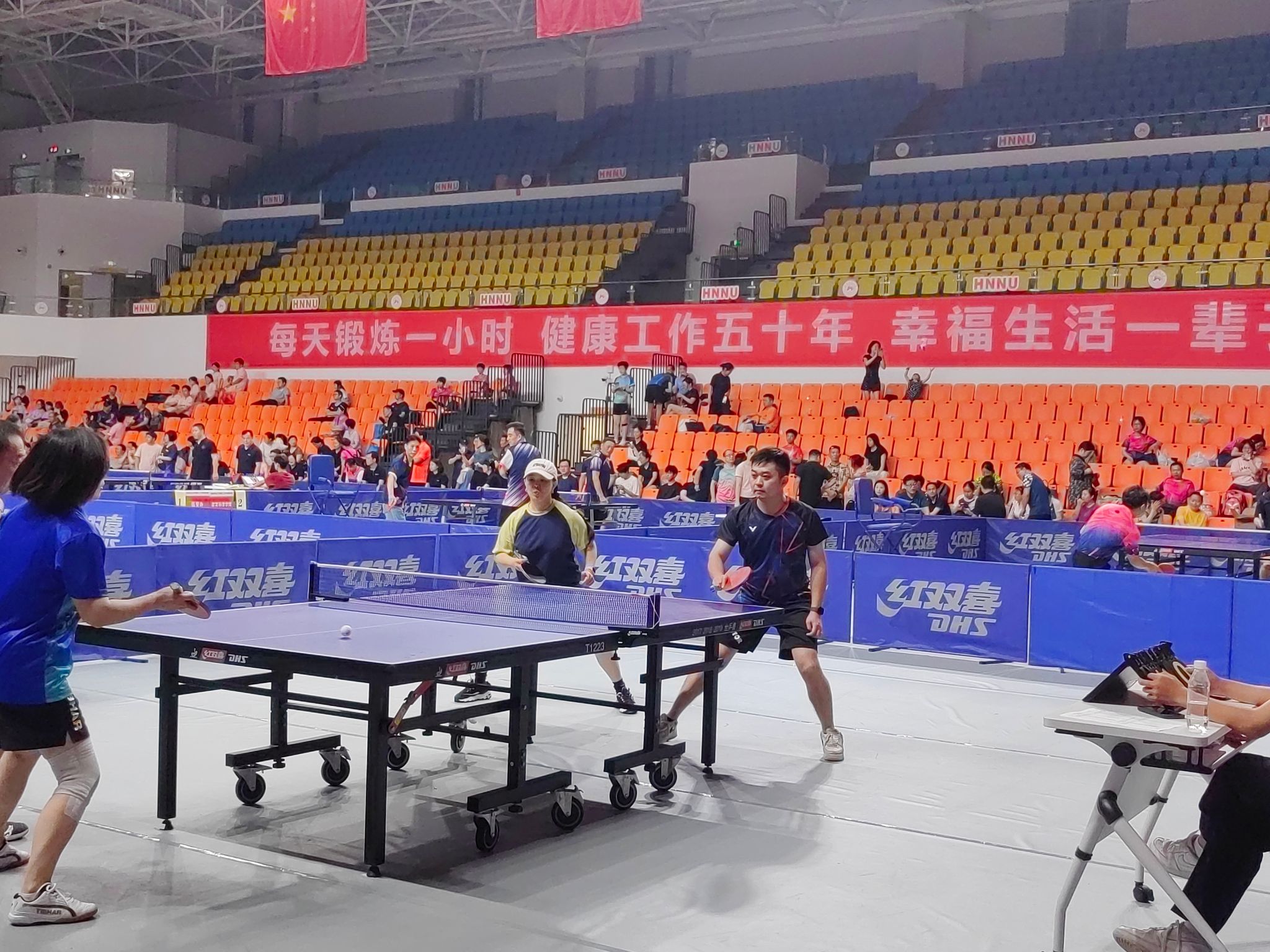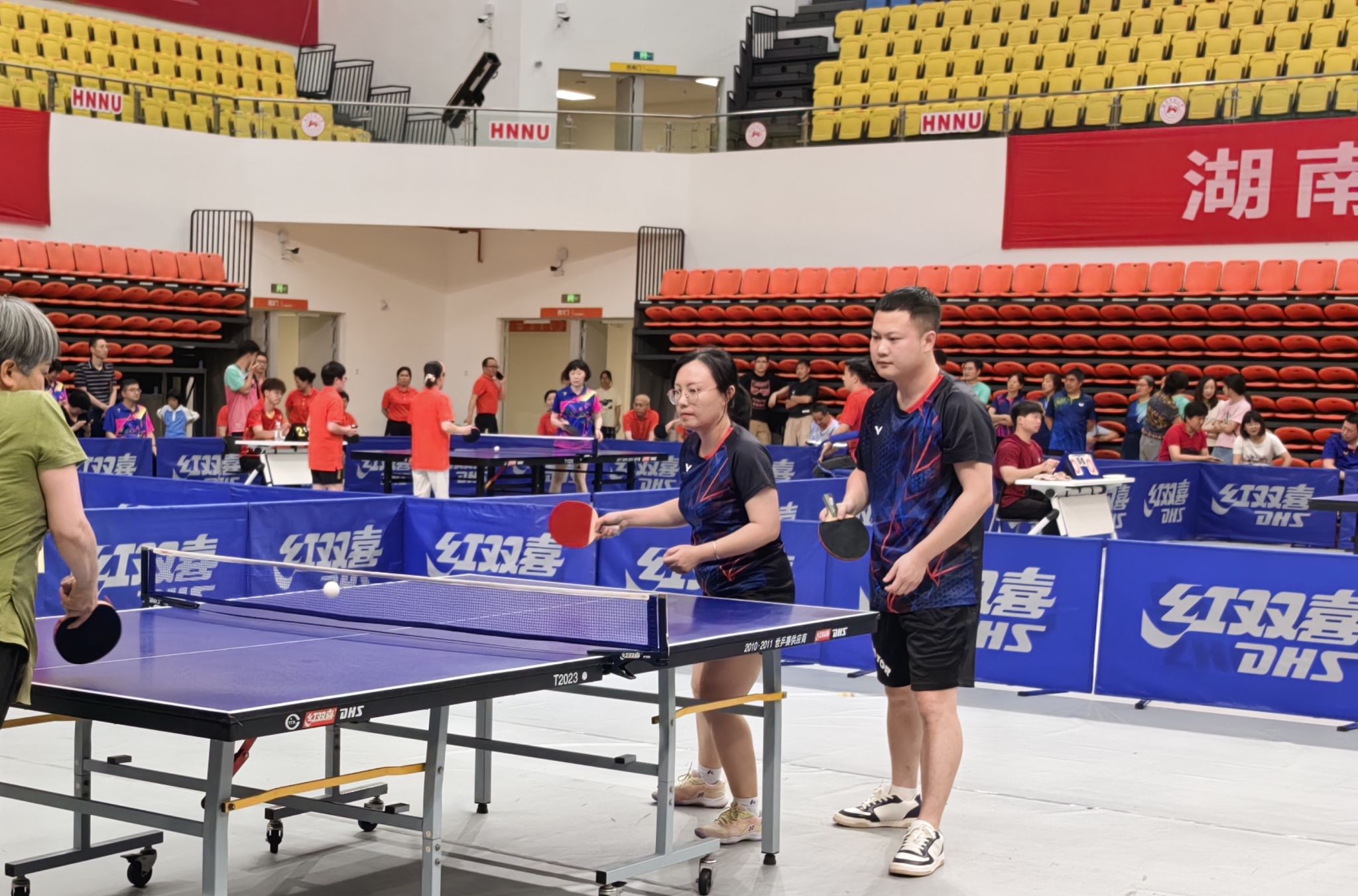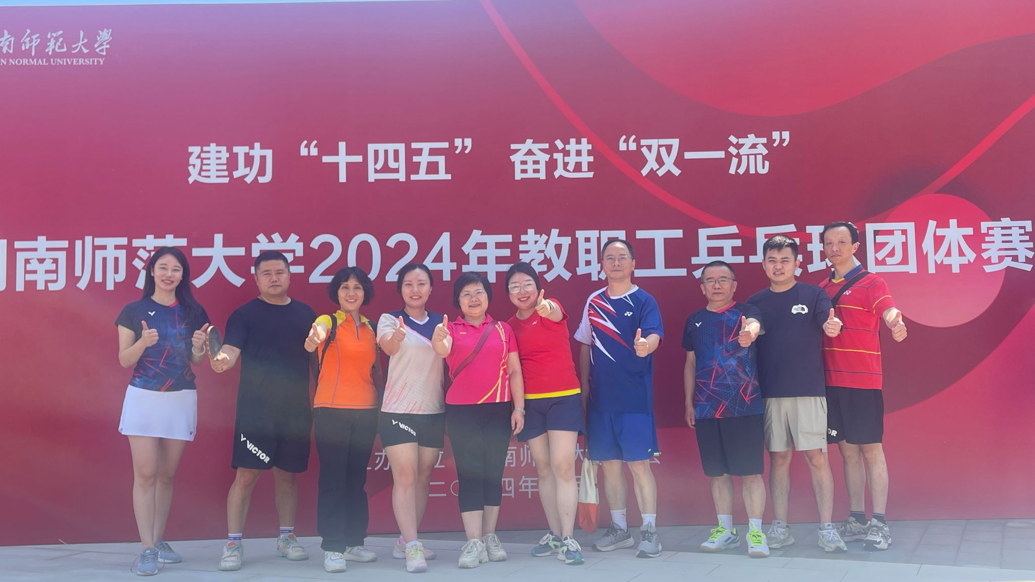 (供稿 院工会)6月20日至21日,湖南师范大学2024年度教职工乒乓球团体赛在校江湾体育馆举行。我院党委书记李正益到现场为参赛教职工加油鼓劲,专职组织员曾南雁以队员身份参加了此次乒乓球团体赛。