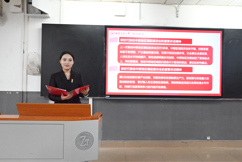 院学生会主席团成员张雨欣传达学习习近平总书记在湖南考察时的重要讲话和指示精神以及新时代推动中部地区崛起座谈会精神、省委常委会(扩大)会议精神、湖南省学联学生会组织骨干专题联学会议精神。她指出,找准学生会工作的切入点、结合点和着力点,帮助广大同学解决急难愁盼问题,提升同学满意度、社会认可度,是学生干部目前的首要任务。