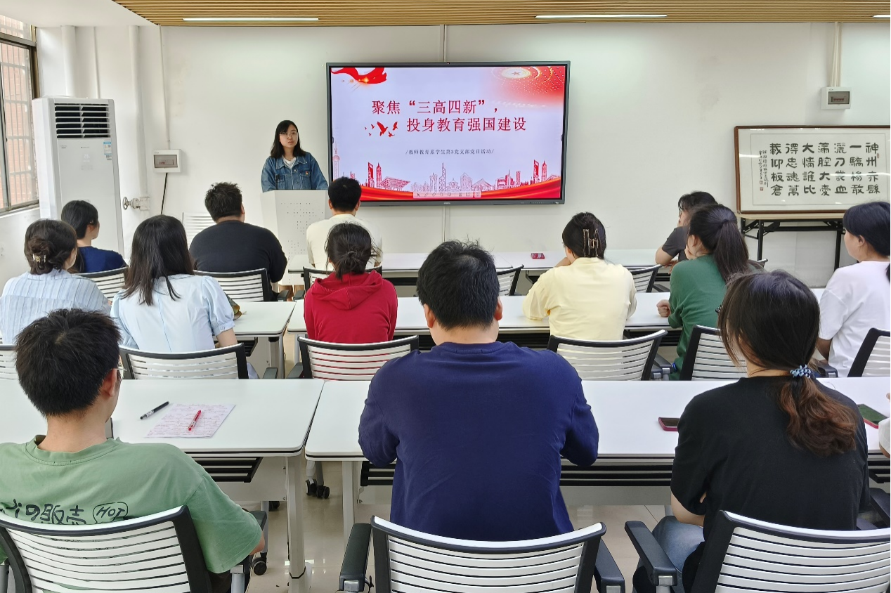 (记者 雷玉婷 唐念祖 常雅欣)4月15日中午,我院教师教育系学生第三党支部在党员之家开展以“聚焦‘三高四新’,投身教育强国建设”为主题的党日活动。教师教育系学生第三党支部第一书记孙一心出席活动,活动由教师教育系学生第三党支部预备党员唐杰主持。