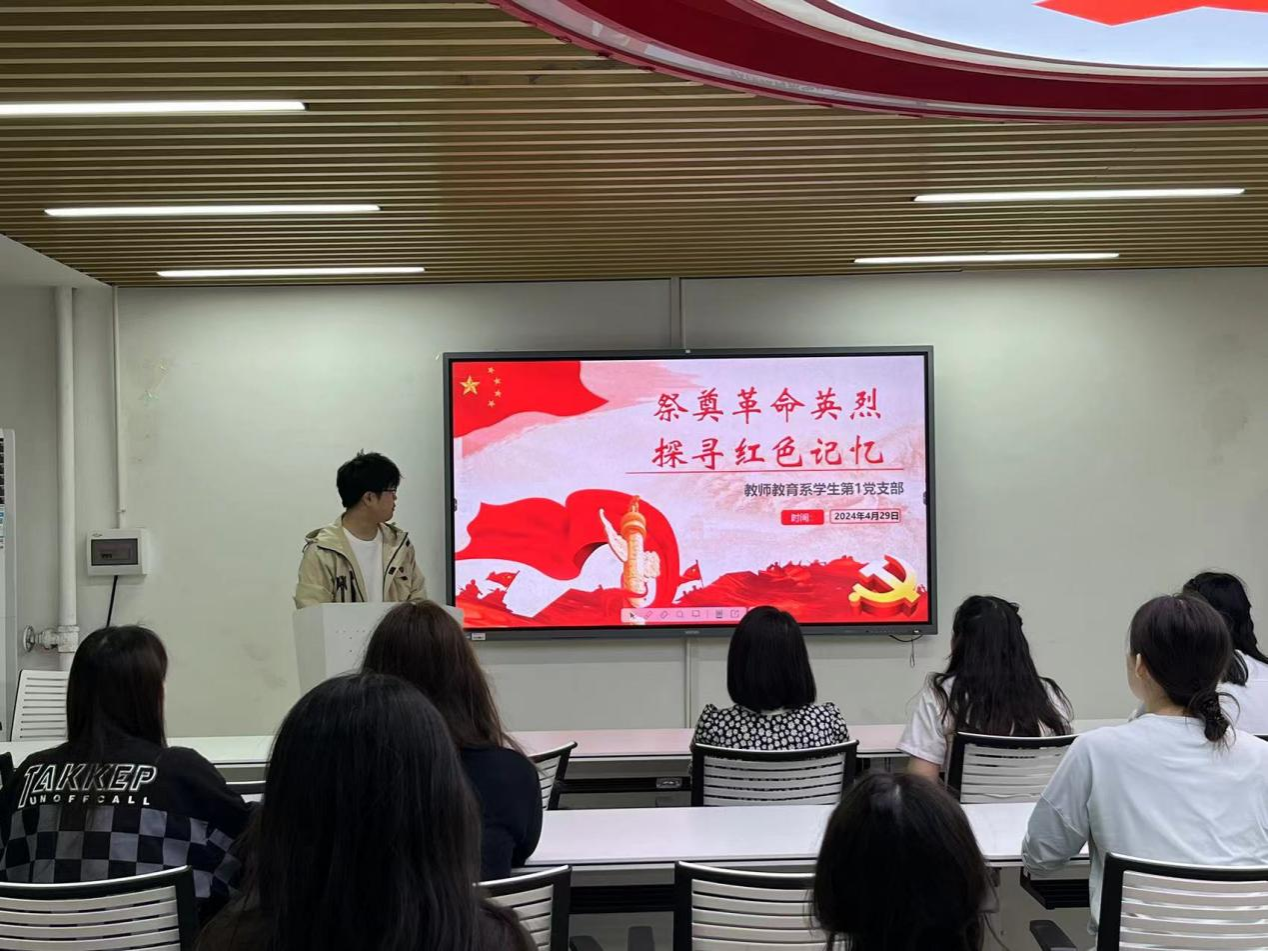 (记者 胡可曼 骆文带 丁弘宇)4月29日中午,我院教师教育系学生第一党支部在党员之家开展以“祭奠革命英烈,探寻红色记忆”为主题的党日活动。教师教育系学生第一党支部第一书记熊椰出席活动。活动由教师教育系学生第一党支部党员丁弘宇主持。
