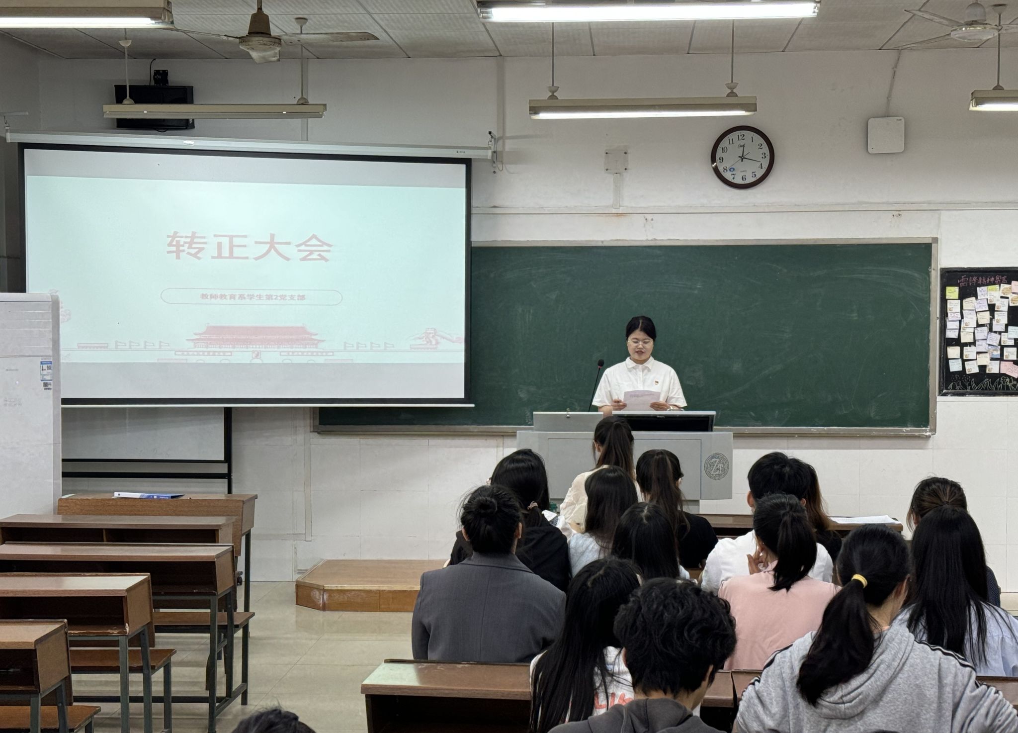 (记者 王倩 马炜浩)5月11日中午,我院教师教育系学生第二党支部在第一教学楼114教室召开预备党员转正大会,教师教育系学生第二党支部第一书记刘佳出席大会。大会由教师教育系学生第二党支部书记陈晶玲主持。