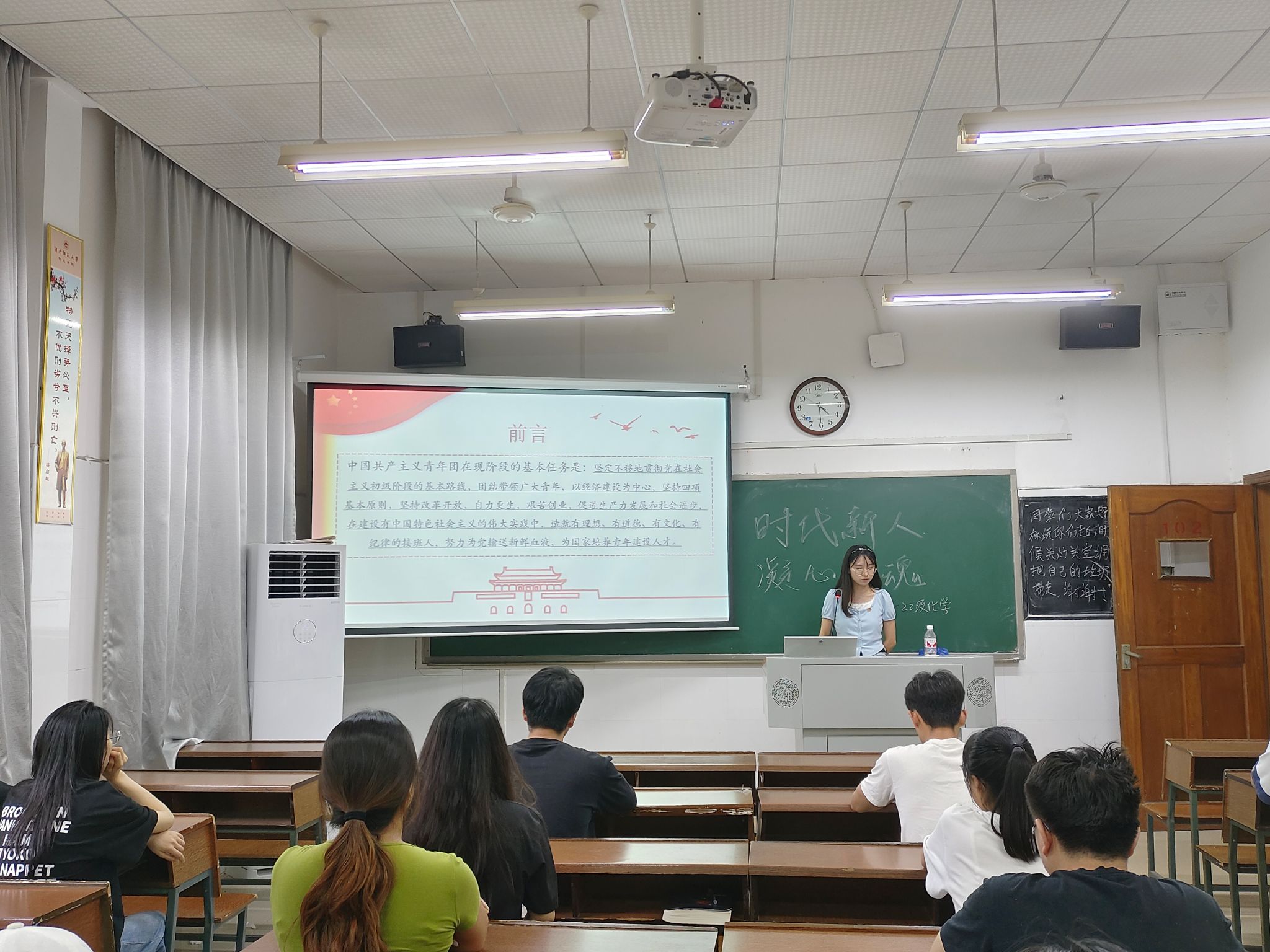 (记者 李皖湘 涂琳 扶康)5月17日下午,我院教师教育系2022级化学专业一班团支部在达善楼102教室开展以“时代新人,凝心铸魂”为主题的团日活动。活动由团支部书记周香主持。