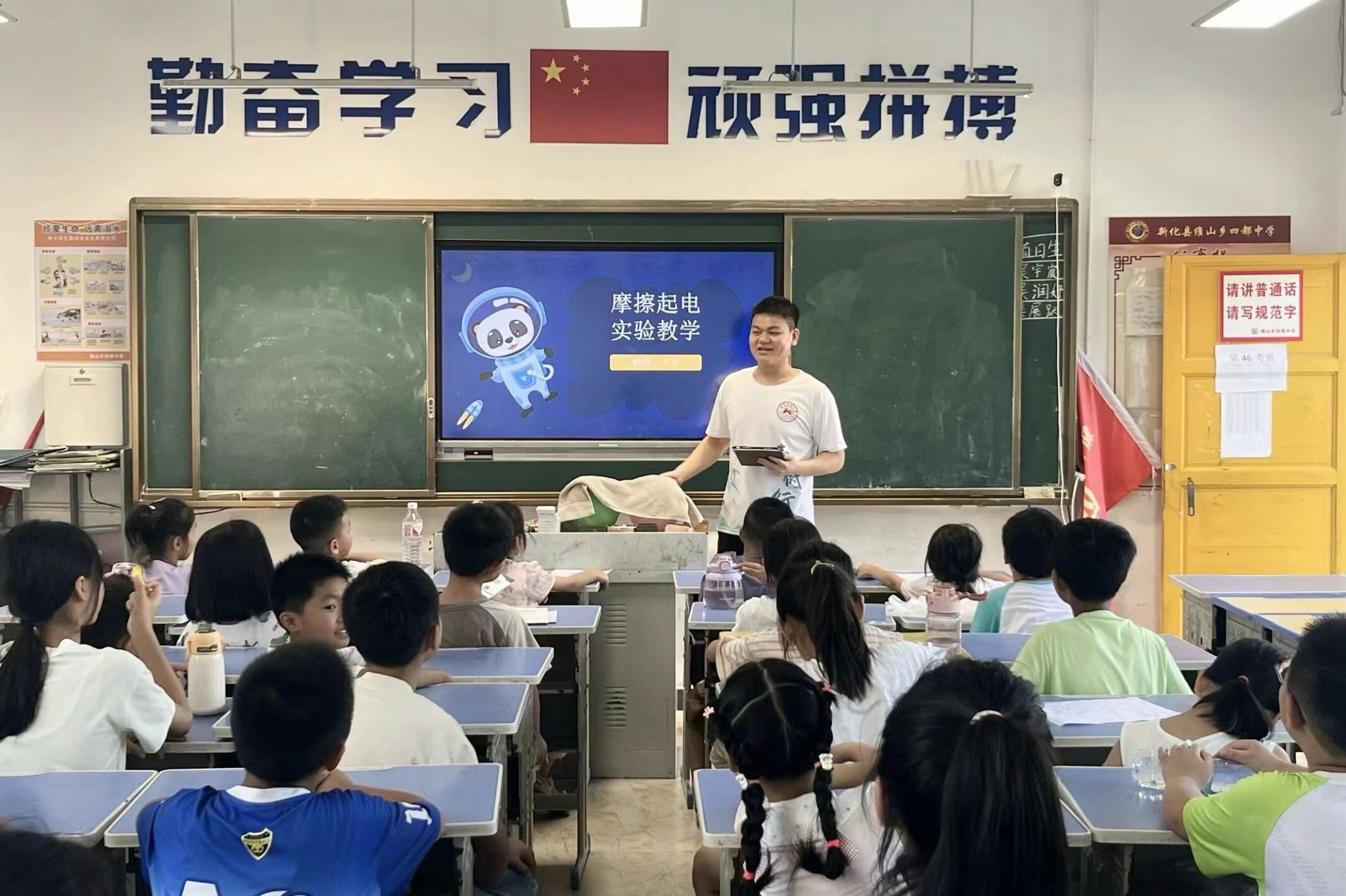 (记者 蒋婷婷 刘艺杰)7月9日上午,我院经管系、理工系三下乡“青树行”暑期社会实践团在四都中学开展物理实验、摩擦生电实验和过滤实验系列实验课程。文娱组组长王俊峰、文娱组组员王杰、调研组组长张洁担任课程主讲人。