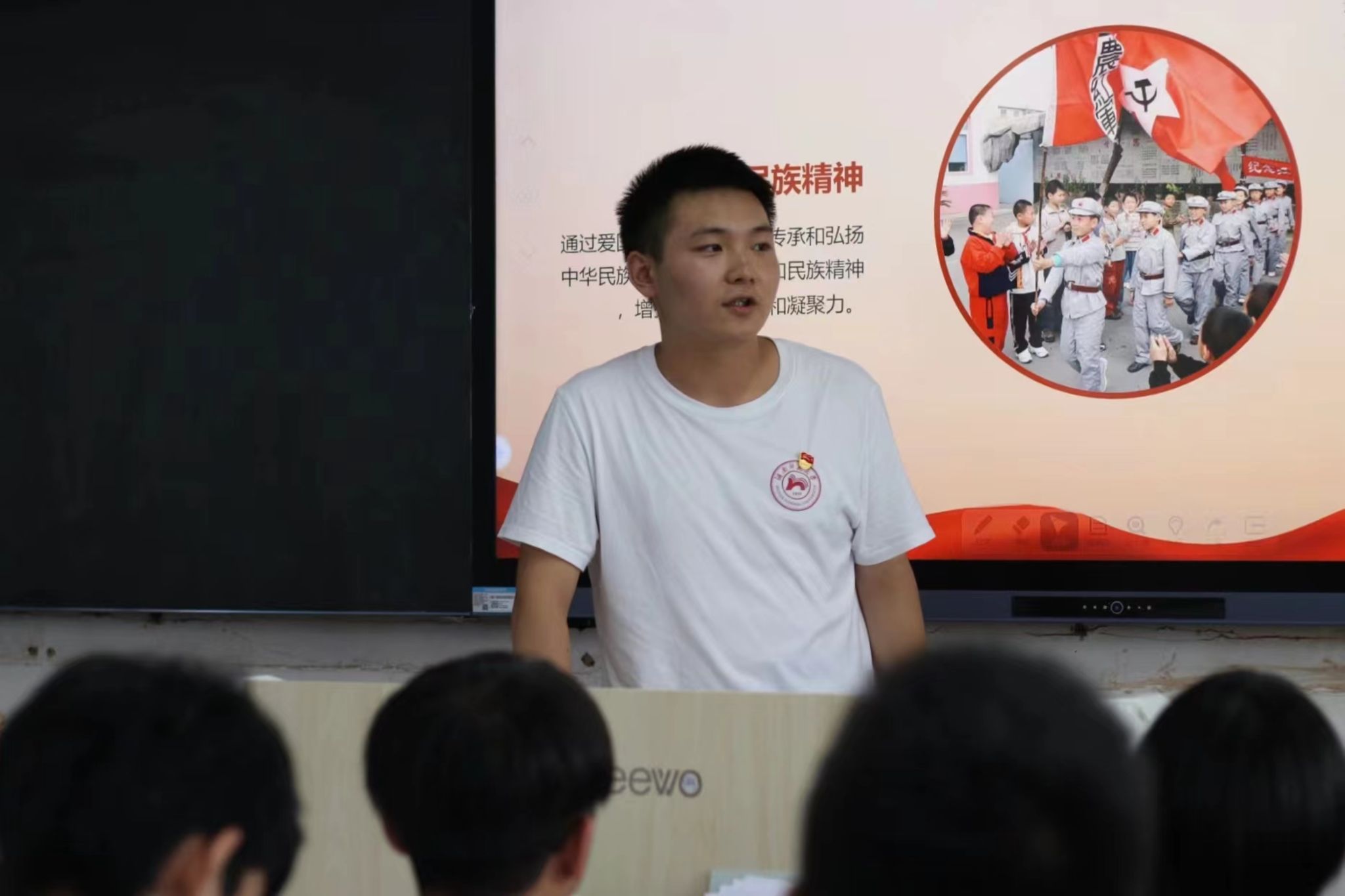 实践团队长肖逸航,实践团成员于果、李苏文、熊贝贝分别讲解了爱国主义教育的主要内容、当代中国的爱国主义教育以及当前爱国主义教育面临的挑战。