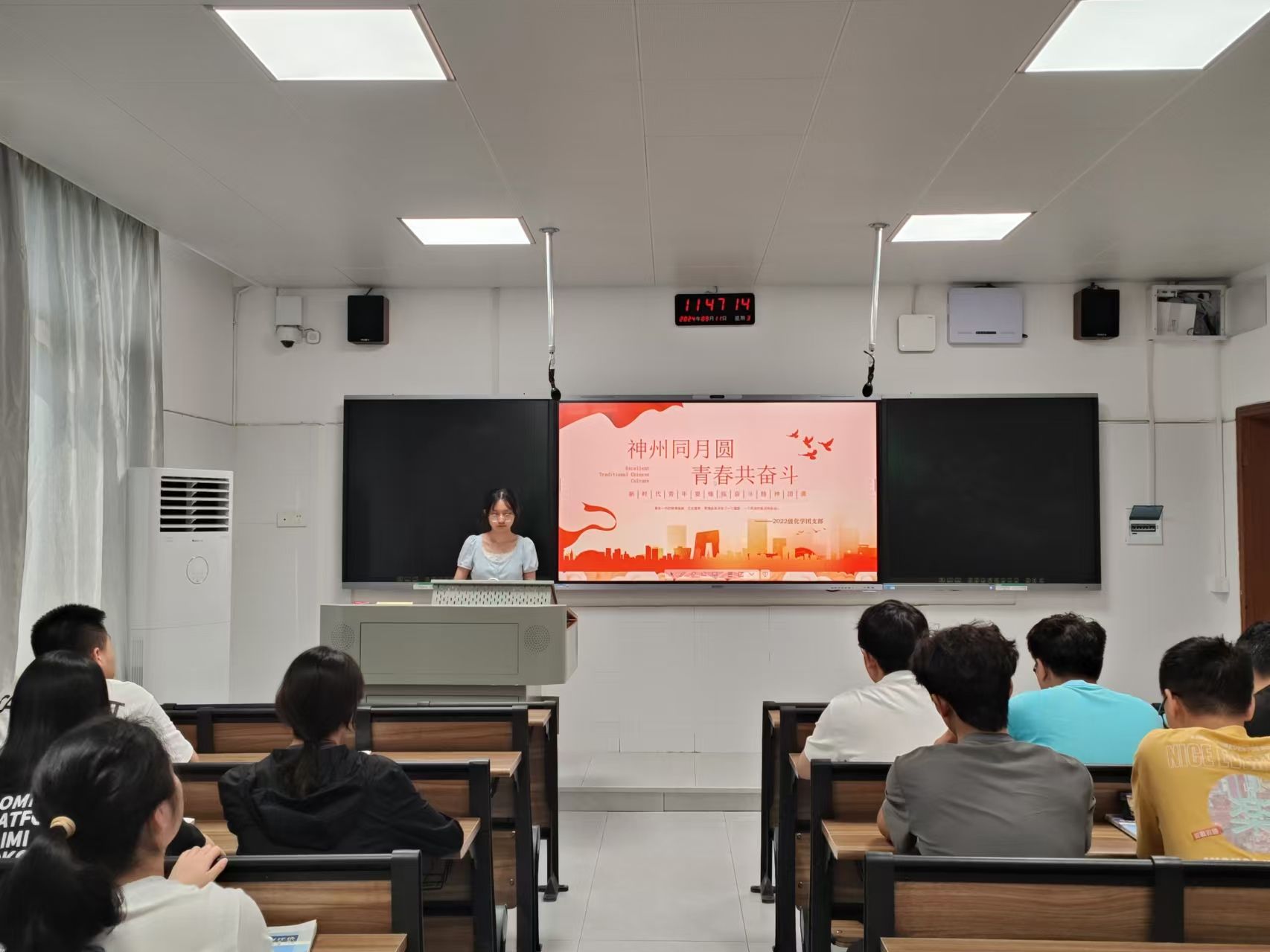 (通讯员 李皖湘 周香 邓裕堃)9月11日中午,我院教师教育系2022级化学一班团支部于达善楼203教室开展以“神州同月圆,青春共奋斗”为主题的团日活动,活动由团支部书记周香主持。