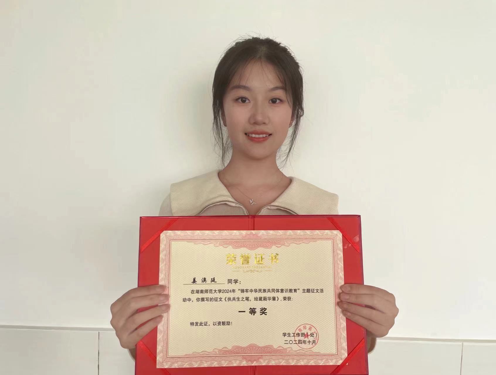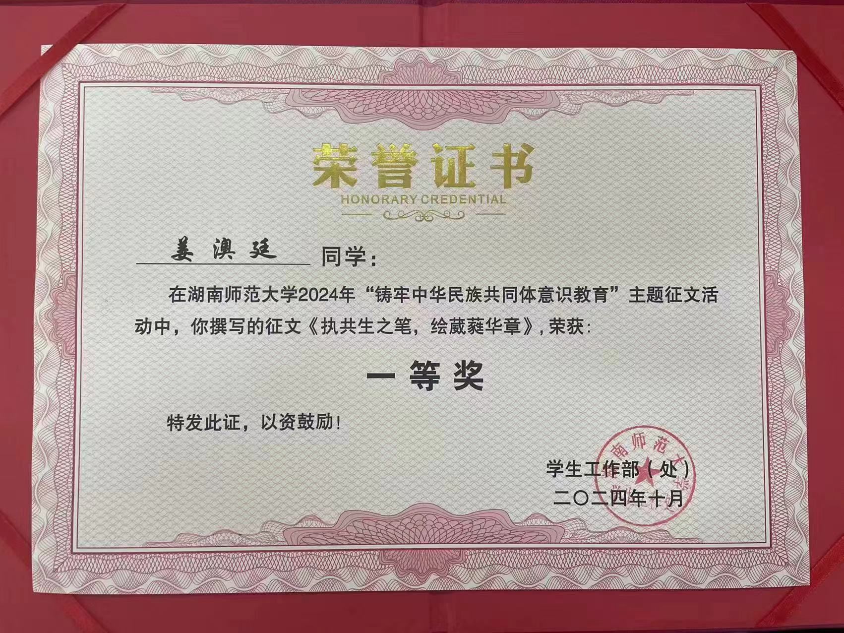 (通讯员 刘婷 蒋雯 谢翠)10月9日,我院文法系2023级汉语言文学专业的姜澳廷在“铸牢中华民族共同体意识教育”主题征文活动中荣获校级一等奖。