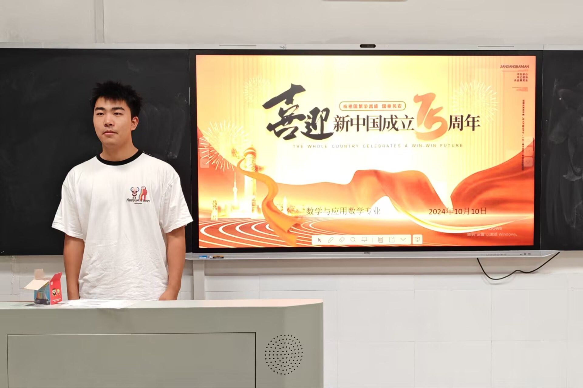 (通讯员 钟嘉逸 贺猛 彭璟怡)10月14日晚上,我院教师教育系2023级数学与应用数学专业一班、二班团支部在第一教学楼101教室联合开展以“厚植家国情怀,青春告白祖国”为主题的团日活动。活动由数学与应用数学专业一班团支部书记贺猛主持。