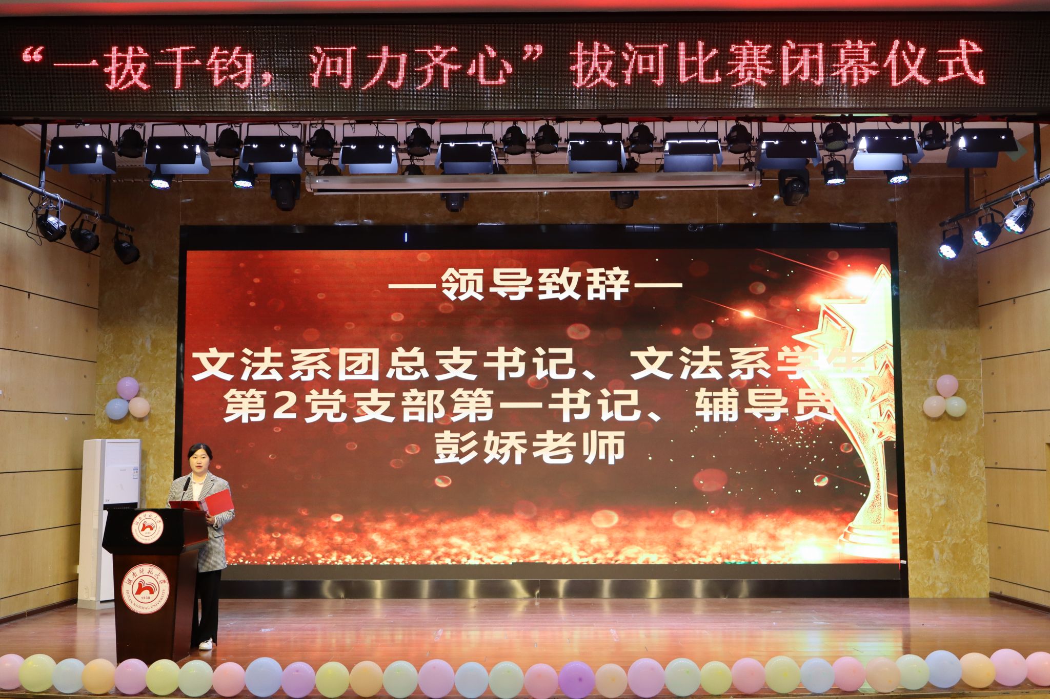(通讯员 康世强 刘婉婷 夏鑫)11月6日中午,我院文法系学生会体育部与学生会文艺部在树达楼113报告厅联合开展以“一拔千钧,河力齐心”为主题的拔河比赛闭幕式。