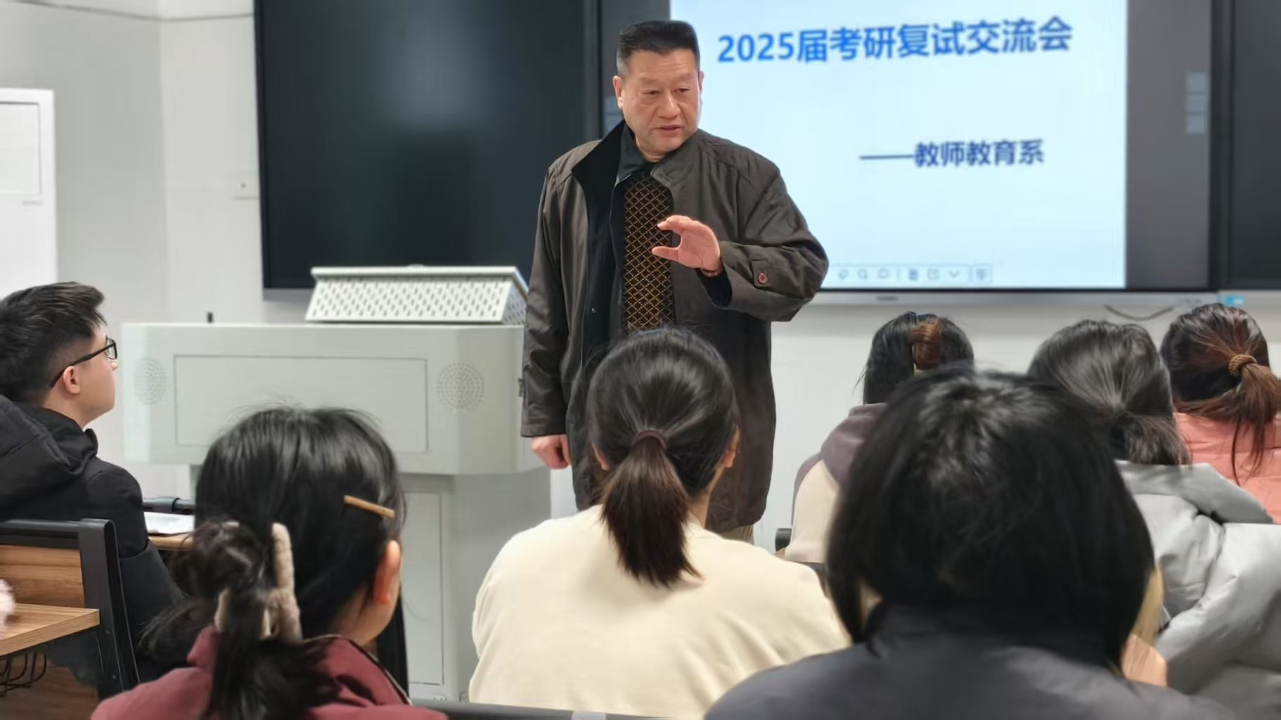 王齐围绕考研复试准备要点对同学们提出三点建议和指导。一是要从仪表着装、语言表达、礼仪规范等细节入手,展现自己积极向上的精神风貌和专业素养;二是要积极调整心态,自信应对挑战,以“平常心”看待复试,用扎实的知识储备和清晰的逻辑思维赢得考官青睐;三是要提前准备好相关证件及资料,避免因疏漏影响复试进程。