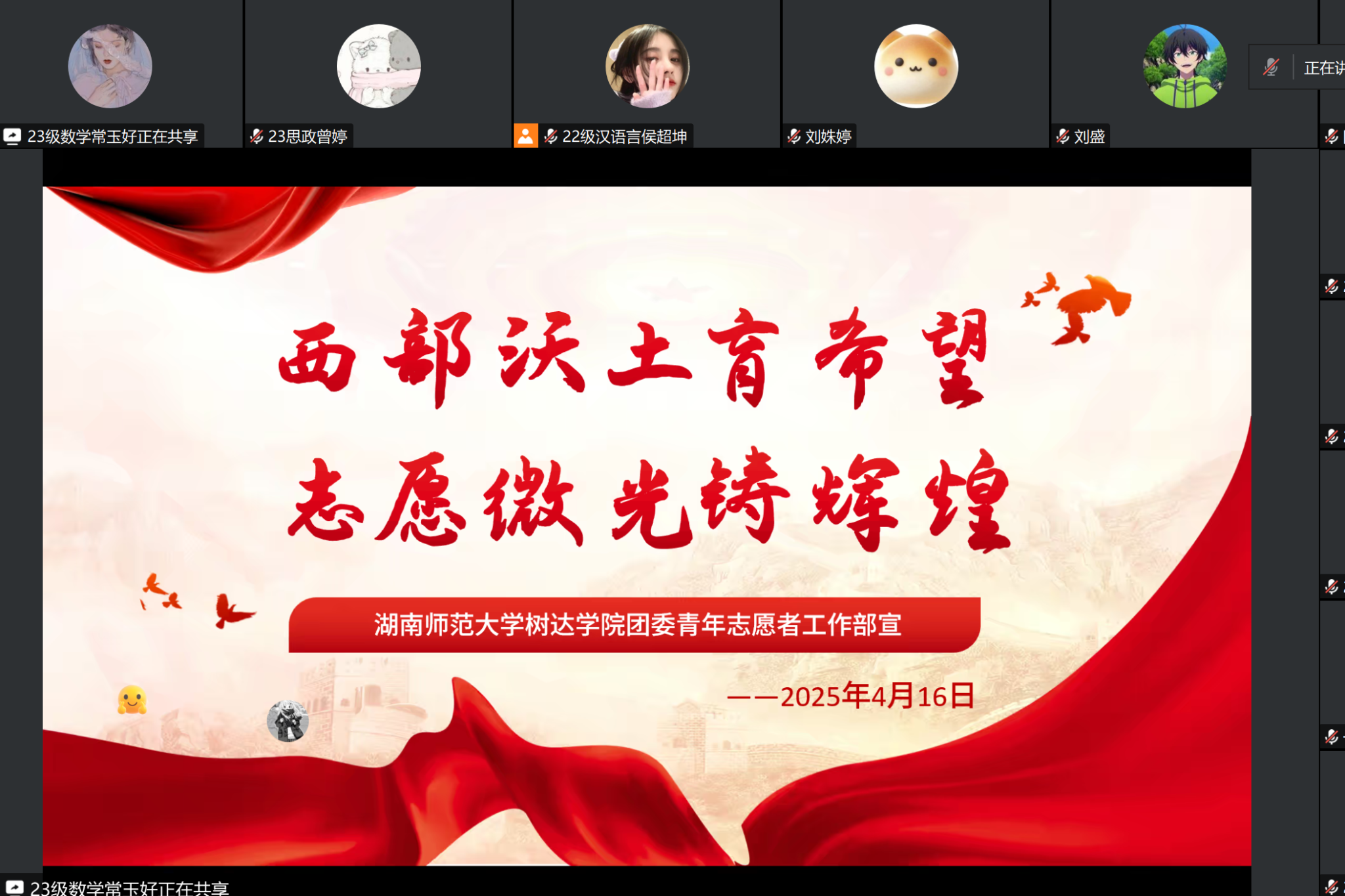(通讯员 常玉好 侯超坤 曾婷)4月16日晚上,我院团委青年志愿者工作部以线上形式召开了以“西部沃土育希望,志愿微光铸辉煌”为主题的西部计划宣讲会。我院团委书记胡蓉、院团委副书记龙珊出席宣讲会。宣讲会由院团委青年志愿者工作部副部长刘姝婷主持。