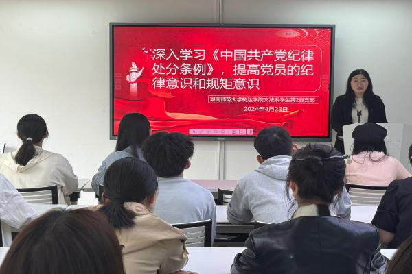 (记者 黄雪琴 李佳怡 周慧)4月23日中午,我院文法系学生第二党支部在党员之家开展关于深入学习《中国共产党纪律处分条例》的学习活动。活动由文法系学生第二党支部第一书记彭娇组织开展。